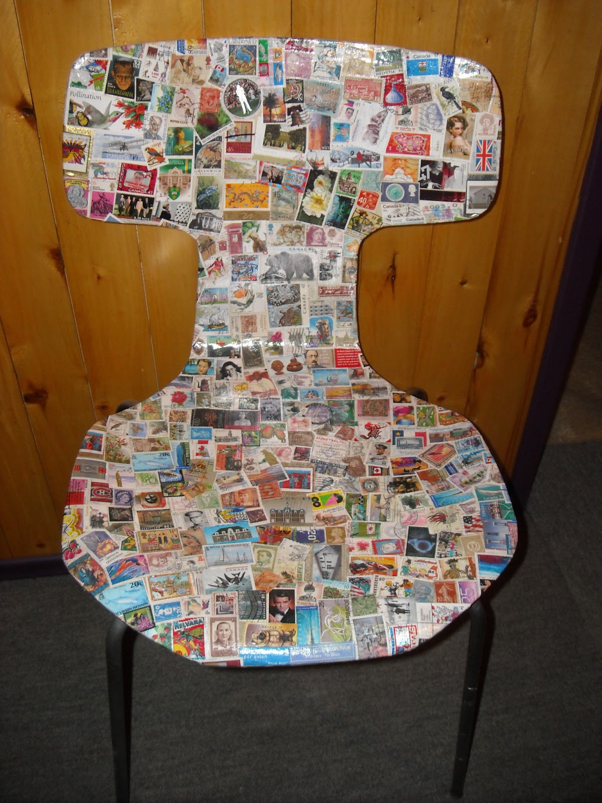 The collection in question at the time was my postage stamps, literally thousands of them ranging from the dull everyday ones to the antiques and globally gathered. Much like my collection of clothing labels (see earlier posts of clothing label quilts I've made), I saw stamps as tiny unique art pieces that tantalize my sense of travel and adventure. How could people overlook these and simply throw them in the garbage without a second thought? So I started to cover furniture with them; first a chair, then a cabinet, a bread board, an old metal file box, a mirror... Visually speaking they are much like the label quilts and they represent a similar disappearing era. People rarely write letters anymore and labels are now being stamped directly on fabric.